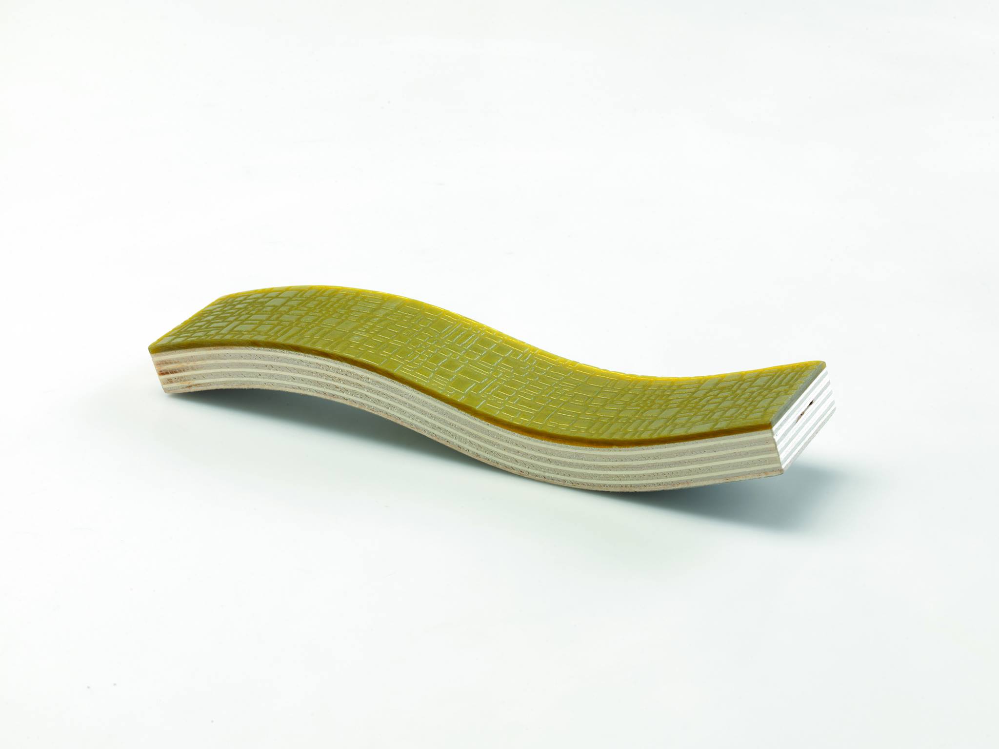 The project combines a curved plywood base with a thin sheet of Alicrite, bonded through an advanced high-frequency process. The result is a surface that is resistant, lightweight, and visually refined—merging technical performance with aesthetic quality.